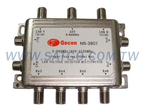 | 衛星用3進8出訊號選擇器,可將線性極化(H/V)衛星訊號分接給多部衛星接收機使用、最多支援8台衛星接收機,ANT輸入端可混入數位電視訊號,使每個端末都能有衛星的H/V及數位電視訊號