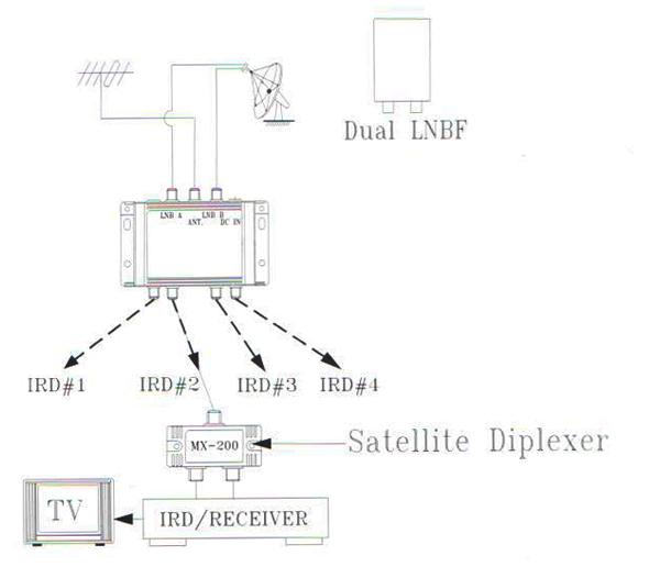 接收機輸出13/18V電壓經過同軸電纜使切換開關切換到相應的埠