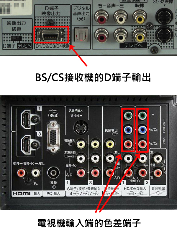 | 早期BS舊款機種由於無HDMI輸出,如要以1080i高畫質的方式呈現,一定要用D端子輸出到電視機的色差輸入, 這樣才能呈現出BS 1080i的精細畫面