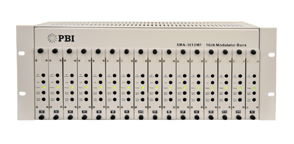 16路類比調變模組櫃由19吋4U主機殼和16個調製模組組成,適用於47 ~862 MHz有線電視傳輸系統;每個模組射頻輸出電平可達105dBμV(混合放大後總輸出最高達117dBμV),每個模組的寄生輸出抑制大比於60dB。射頻輸出電平、單通道射頻、音訊調頻調製度、視頻調製指數和A/V比可調。調製模組可選擇固定頻和捷變頻,頻道選擇靈活,經濟實用、性能穩定,操作簡單,是搭建小型有線電視頭端的良好選擇。
