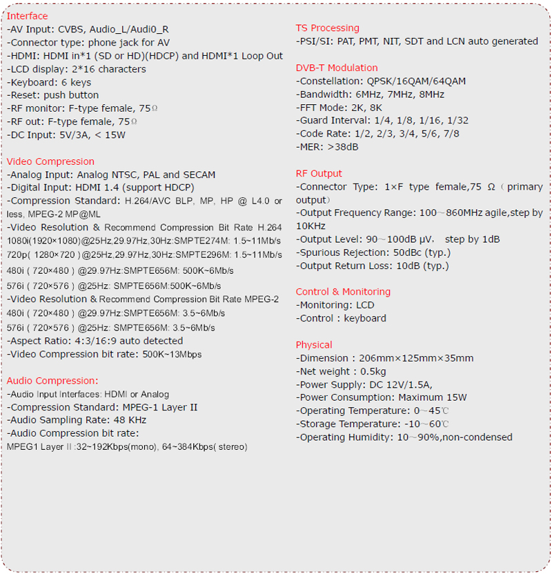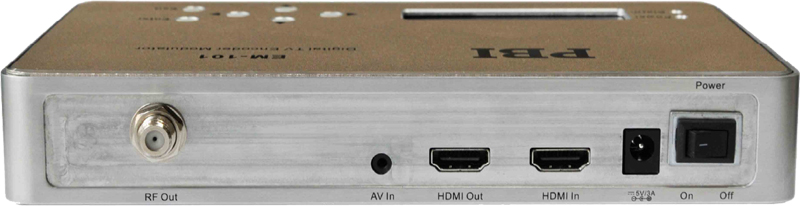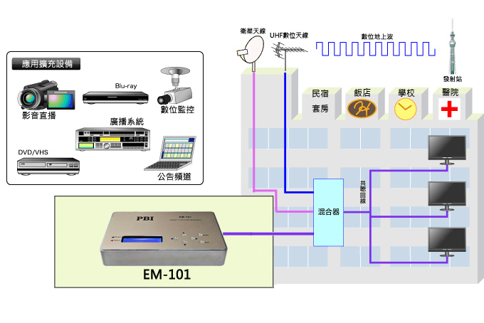 EM-101 可將任何影音設備(HDMI、CVBS輸出) ,數位調變成DVB-T格式,與國內20台數位電視整合為單一線路,用戶端電視機只要具備接收國內數位電視的功能,就能同步接收EM-101所傳輸的HD影音節目