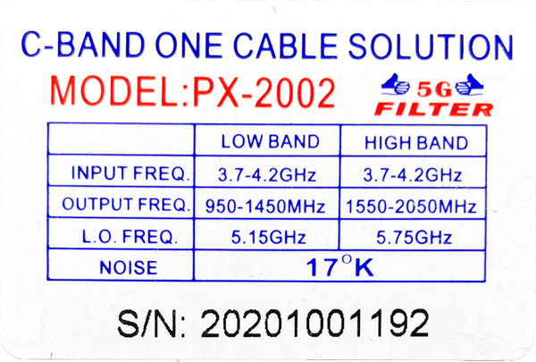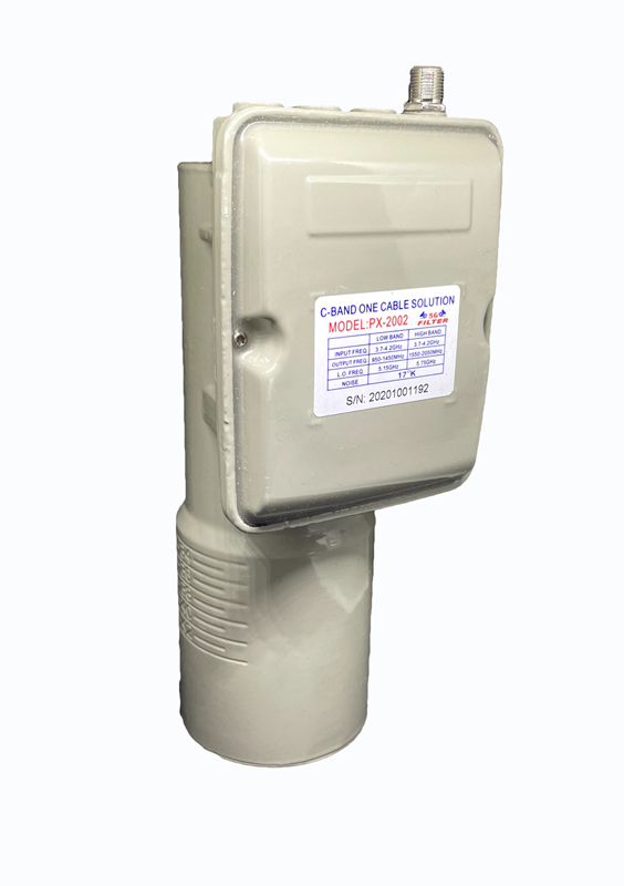 PX-2002採用雙本振 5150MHz/5750MHz單輸出介面,水平和垂直極化節目同時輸出,輸出頻率為水平極化950--1450MHz,垂直極化1550--2050MHz。