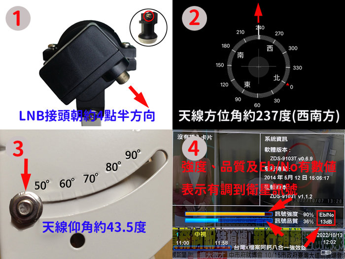 將訊號線2端分別接上LNB及機上盒後就可以開始調整天線位置,還沒調到衛星訊號時,上述的3項數值皆會是0,有調到衛星訊號時3項數值才會同步變化,收到的訊號越強則數值越高,60cm衛星天線通常Eb/No值都可收到12dB以上,這數值可以做為衛星天線有無對準衛星訊號的依據。訊號值如沒有達到12dB以上,請先確認安裝位置面向衛星的天空是否有障礙物阻擋衛星訊號,如果沒有請再重複微調天線的仰角、方位角及LNB極化角的精細微調(LNB 4點半順時針及逆時針方向微調)